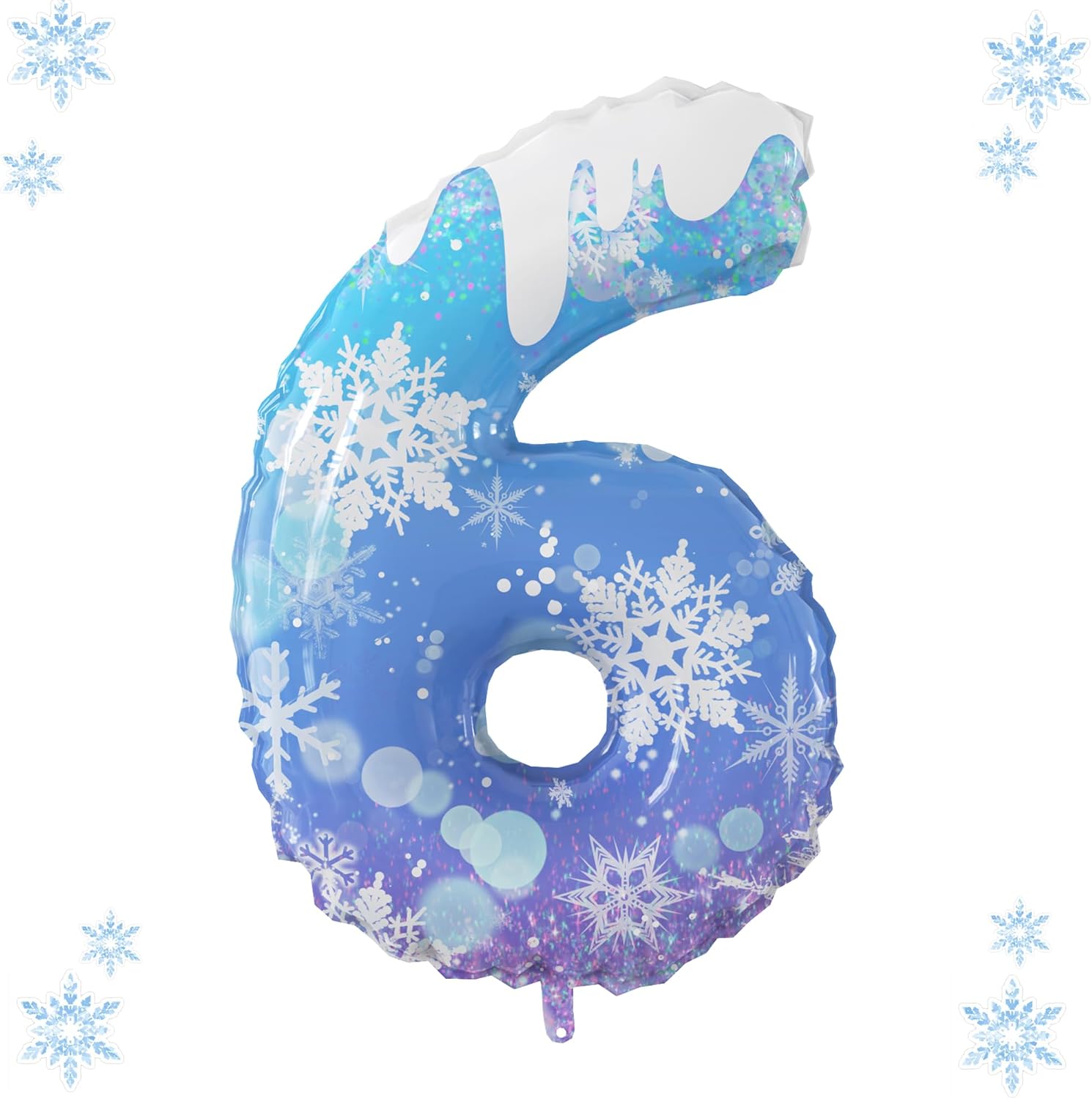 Beautiful Snowflake Design: Celebrate in style with this Frozen-themed 40-inch Number 6 balloon, perfect for girls’ 6th birthdays. Featuring classic blue and purple hues with sparkling snowflake accents, it adds a magical touch to any party.