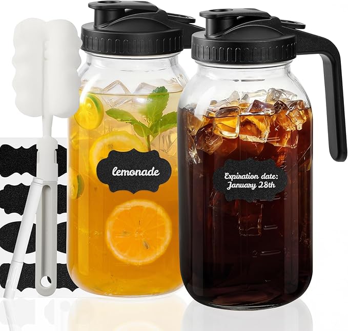 This 2-piece set of 64 oz glass pitchers with lids is perfect for serving coffee, juice, iced tea, sun tea, cocktails, bubble tea, smoothies, and more. Ideal for family gatherings, outdoor picnics, or everyday use, their classic mason jar design adds charm and elegance to any occasion.