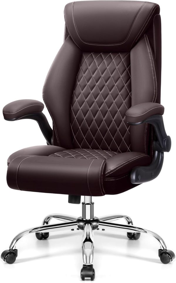 Big and Tall Executive Leather Office Chair with Rocking Function, Ergonomic Computer Chair with Lumbar Support and Flip-Up Armrests, Ideal for Home Office and Gaming Comfort