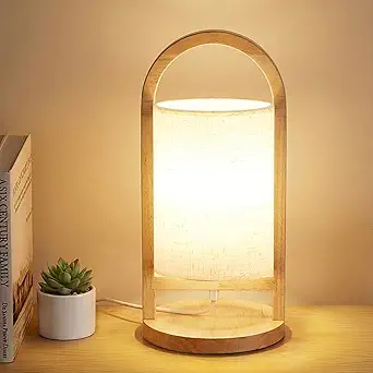 Portable bedside table lamp with a built-in handle, featuring three adjustable color temperatures. Designed with a natural wood base and a linen fabric shade, this modern LED lamp is ideal for bedrooms, living rooms, offices, and dorm rooms. LED bulb included.