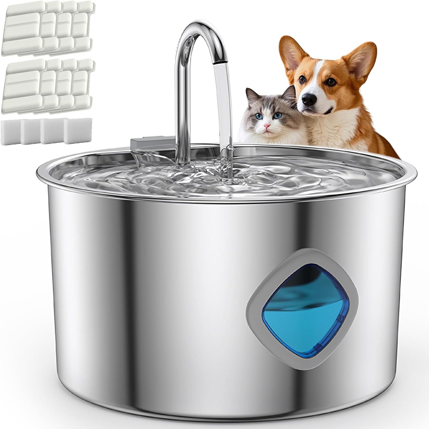 Stainless Steel Cat Water Fountain, 3.2L (108oz) Automatic Drinking Fountain for Cats and Small Dogs, Ultra-Quiet Design with 8 Replacement Filters for Indoor Use