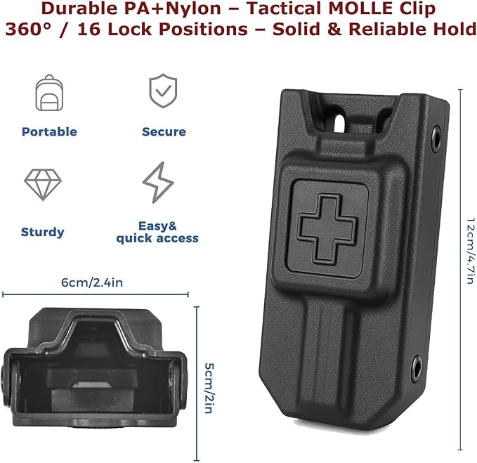 In life-threatening situations, being able to stop bleeding quickly can save lives. This tactical holder is a safe way to carry one of the most important emergency medical tools because it is strong, easy to reach, and can be mounted in many different ways.